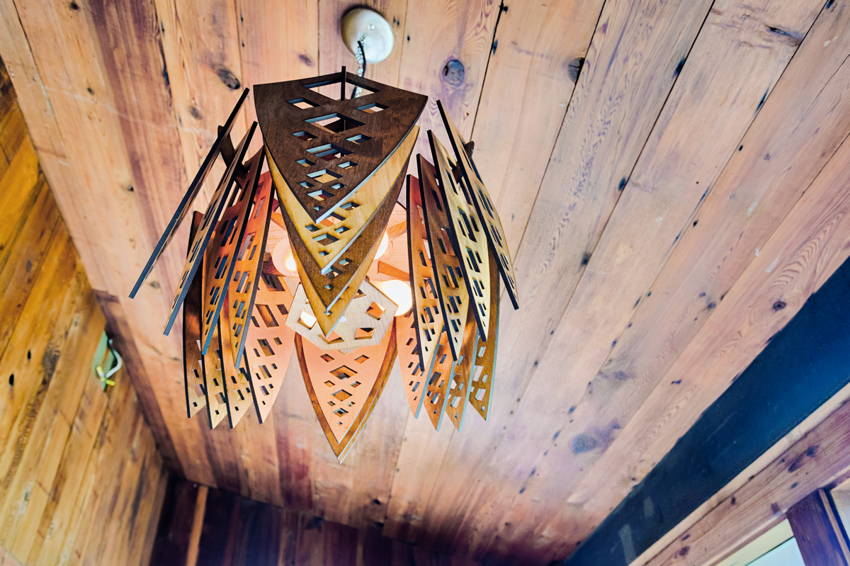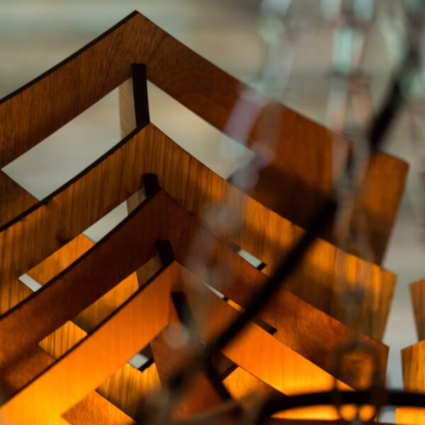 Layered panels of light and dark stained MDF fan out, gently casting light across the space. Delicate cutouts in each petal add to the layered effect, allowing glimpses of light and dark to dance across the eyes.